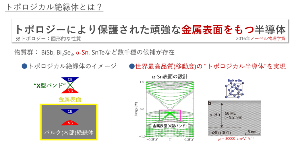 千葉研究室では、シリコン(Si)などの一般的な半導体と同じダイヤモンド構造をもつアルファ–スズ(α-Sn)に着目して研究を行っています。α-Snにはトポロジカル物質としての特性だけでなく、シンプルかつ環境に優しいという長所があります。これまでに東京大学Le Duc Anh研究室と共同で、世界最高品質のα-Sn薄膜をIII-V族半導体InSb基板上に結晶成長させることに成功し、第一原理バンド計算と呼ばれる計算機シミュレーションに基づいてα-Sn薄膜の多彩なトポロジカル物性を世界で初めて明らかにしました[1]。最近では、α-Snのスピントロニクス応用として、典型的な磁性体であるFeとの接合膜を作製し、スピン伝導現象[2,3]やトポロジカル相転移[4]の研究を行っています。