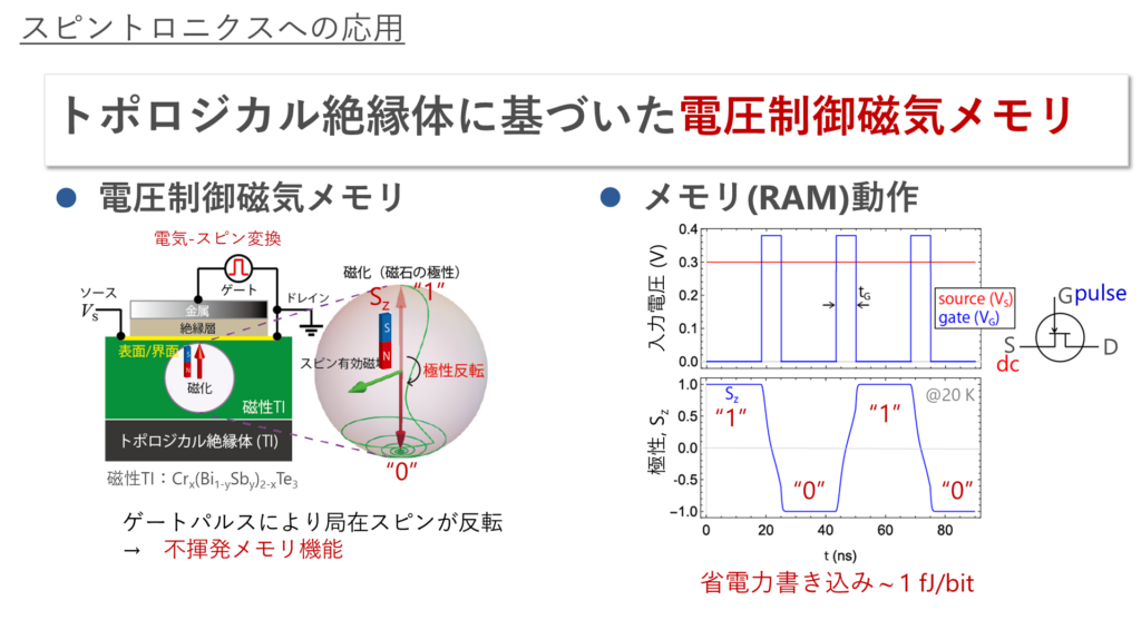 上記の問題を動機として、千葉研究室では、近年物質科学の分野において大きな注目を集めるトポロジカル絶縁体を活用した新たな磁気物性の電圧制御を理論的に研究しています。トポロジカル絶縁体では、スピン運動量ロッキングと呼ばれる性質から効率的な電荷-スピンの相互変換が可能です。そこで、磁性体とトポロジカル絶縁体の接合界面に形成される二次元電子系を活用することによって、電圧印加により界面状態に由来した垂直磁気異方性のスイッチィング[2]と磁化ダンピングのオーダー変調[3]が可能になることを物理モデリングに基づいて示しました。さらに、それらをスピントロニクスに応用した磁化反転手法[2,4]について提案しています(下の図解)。詳細に関しては、こちらの解説をご覧ください。