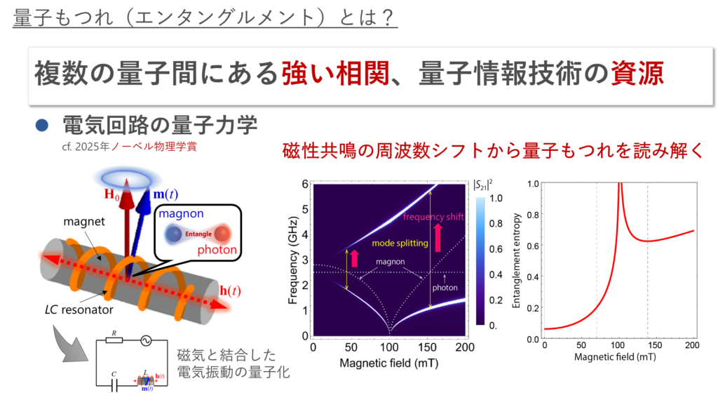 千葉研究室では、結合の強さがマグノンやマイクロ波そのものの固有周波数と同じくらい、あるいはそれ以上になる超強結合や深強結合と呼ばれる領域に注目して共振器マグノニクスの研究を推進しています[1,2]。鉄芯コイルを含む有効的なLC共振回路(下の図解)において、マグノンとマイクロ波光子の結合が深強結合になると、異常な周波数シフトが起こることを見出しました[3]。これは、単なるエネルギーのやり取りでは説明できず、量子力学特有の効果が現れていることを意味します。この効果によって、真空状態であってもマグノンと光子が同時に現れ、量子的にもつれた状態が生じます。重要な点は、この「もつれ」の強さや真空の量子揺らぎが、実験で観測可能な周波数シフトと直接関係していることを明らかにした点です。つまり、難しい量子測定を行わなくても、強磁性共鳴の測定から量子情報的な性質を評価できる可能性が示されました。さらに、千葉研究室では超強結合を活用したメーザー(マイクロ波版のレーザー)の研究も行っています[4]。詳細に関しては、こちらの記事をご覧ください。