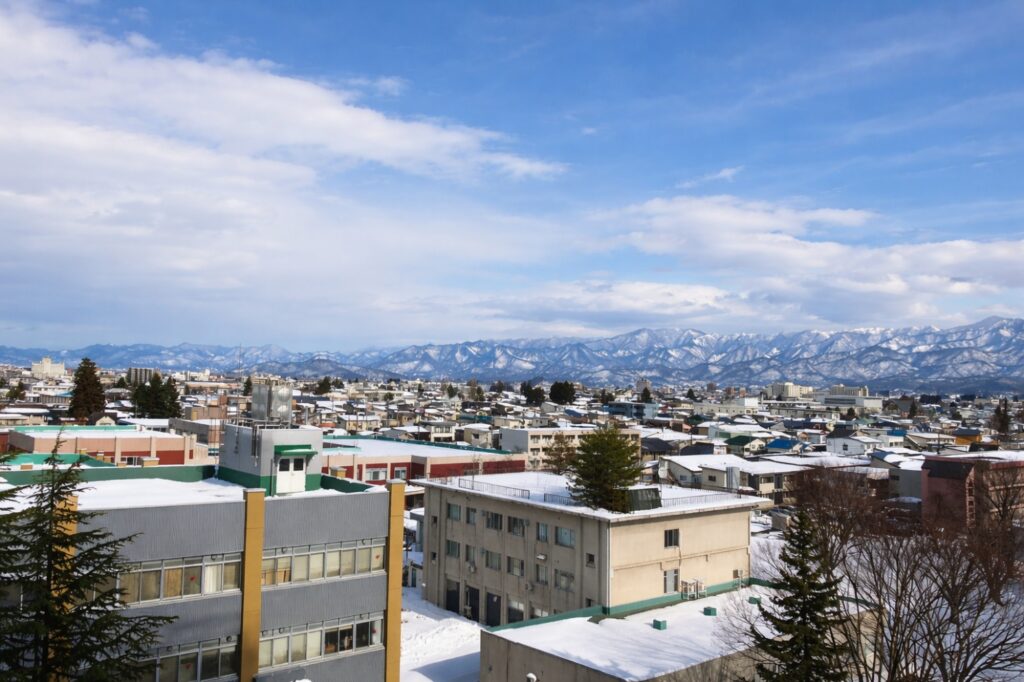 研究室の窓からは、奥羽山脈や朝日山地を背景に米沢市内を見渡すことができます。ふとした時にシミュレーションで疲れた目を癒すことができます。